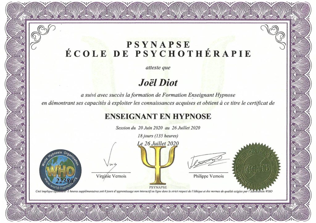 Joël Diot est praticien et formateur en hypnose, PNL et thérapies brèves. Son accompagnement est personnalisé, profond et orienté vers le changement concret.